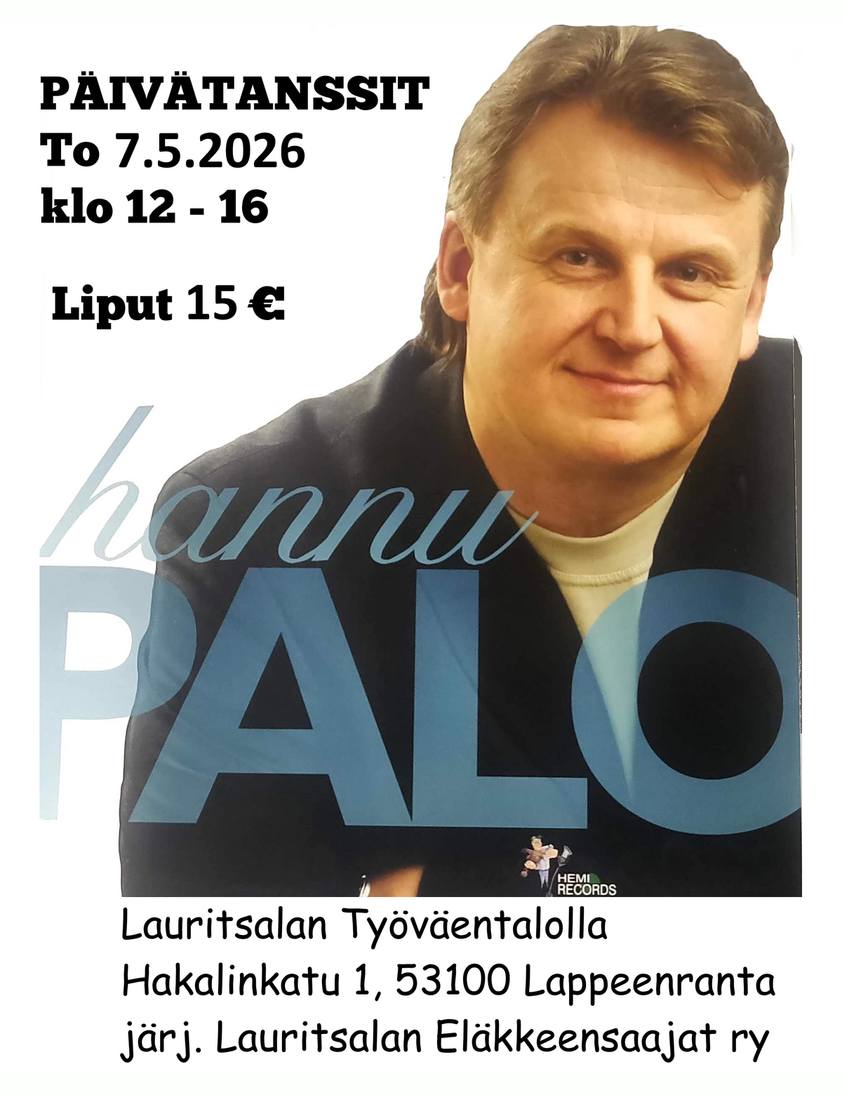 Hinta 15€ sis. kahvilipun. Lämpimästi tervetuloa. Tanssit tähdittää Hannu Palo, Jani Helenius ja Roulette