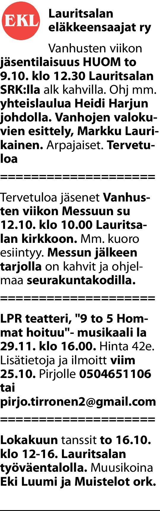 Syksy saapuu ja kerhotoiminnat käynnistyy Lauritsalan Työväentalolla seuraavasti - Boccia alkaa ke 6.9. - Muistikerho alkaa ti 5.9. - Näytelmäkerho alkaa ke 13.9. - Peli- ja neulekerho alkaa to 14.9.…
