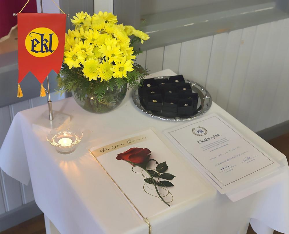 Seuraavaksi vuorossa oli yhdistyksen toiminnassa asioituneiden jäsenten muistaminen ja ansiomerkkien jako. Ansioituneita jäseniä ovat Tuulikki Joela (Kultainen ansiomerkki), Helli Halonen, Jukka Heiska, Riitta Heiska, Pirkko Kallunki, Esko Maijanen, Keijo Puheloinen, Pekka Rossi, Eija Suutari ja Eero Tirronen. Helli Halonen piti kiitospuheenvuoron kaikkien ansioituneiden jäsenten puolesta.